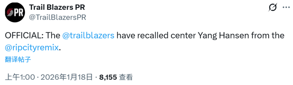 雷竞技平台-开拓者官宣召回杨瀚森!今日有望出战湖人 近两场G联赛场均18+12